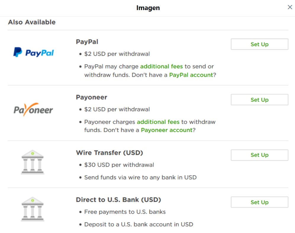 - Pasemos a los métodos de pago - Ambos utilizan métodos similares (PayPal es una constante) - También ofrecen transferencia directamente a un banco de USA (en UpWork tiene que ser cuenta propia, en Fiverr no estoy seguro). (La foto referencia es de UpWork)
