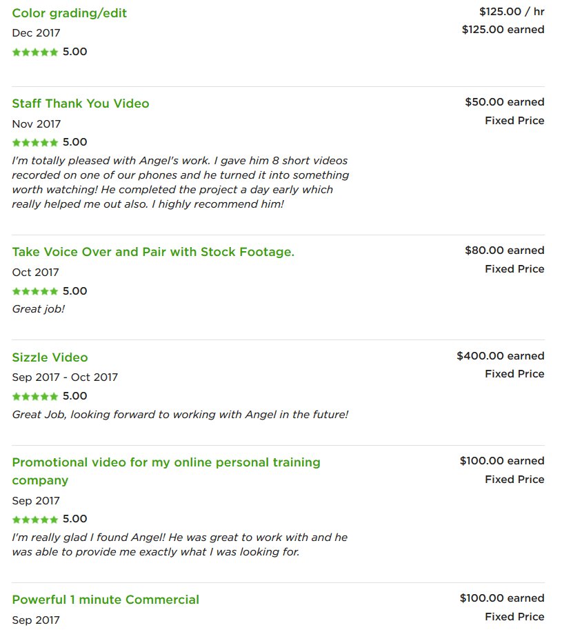 - Mi primer trabajo en UpWork lo conseguí porque ofrecí editar un video de hoy para hoy como "prueba" - Si no le gustaba el video, no me lo tenía que pagar. Lo edité, le puse una marca de agua de "prueba", le gustó y me pidió que le quitara la marca, así gané mi primer cliente.
